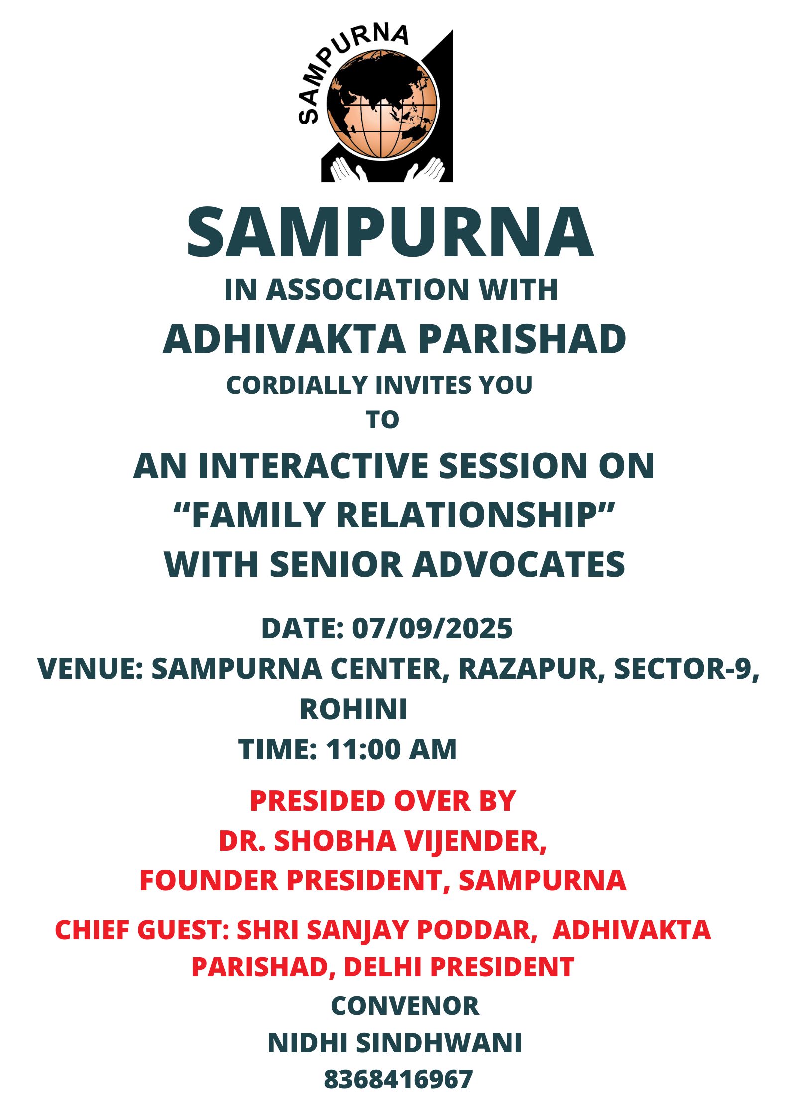 SAMPURNA IN ASSOCIATION WITH ADHIVAKTA PARISHAD CORDIALLY INVITES YOU ΤΟ AN INTERACTIVE SESSION ON "FAMILY RELATIONSHIP" WITH SENIOR ADVOCATES DATE: 07/09/2025 VENUE: SAMPURNA CENTER, RAZAPUR, SECTOR-9, ROHINI TIME: 11:00 AM...