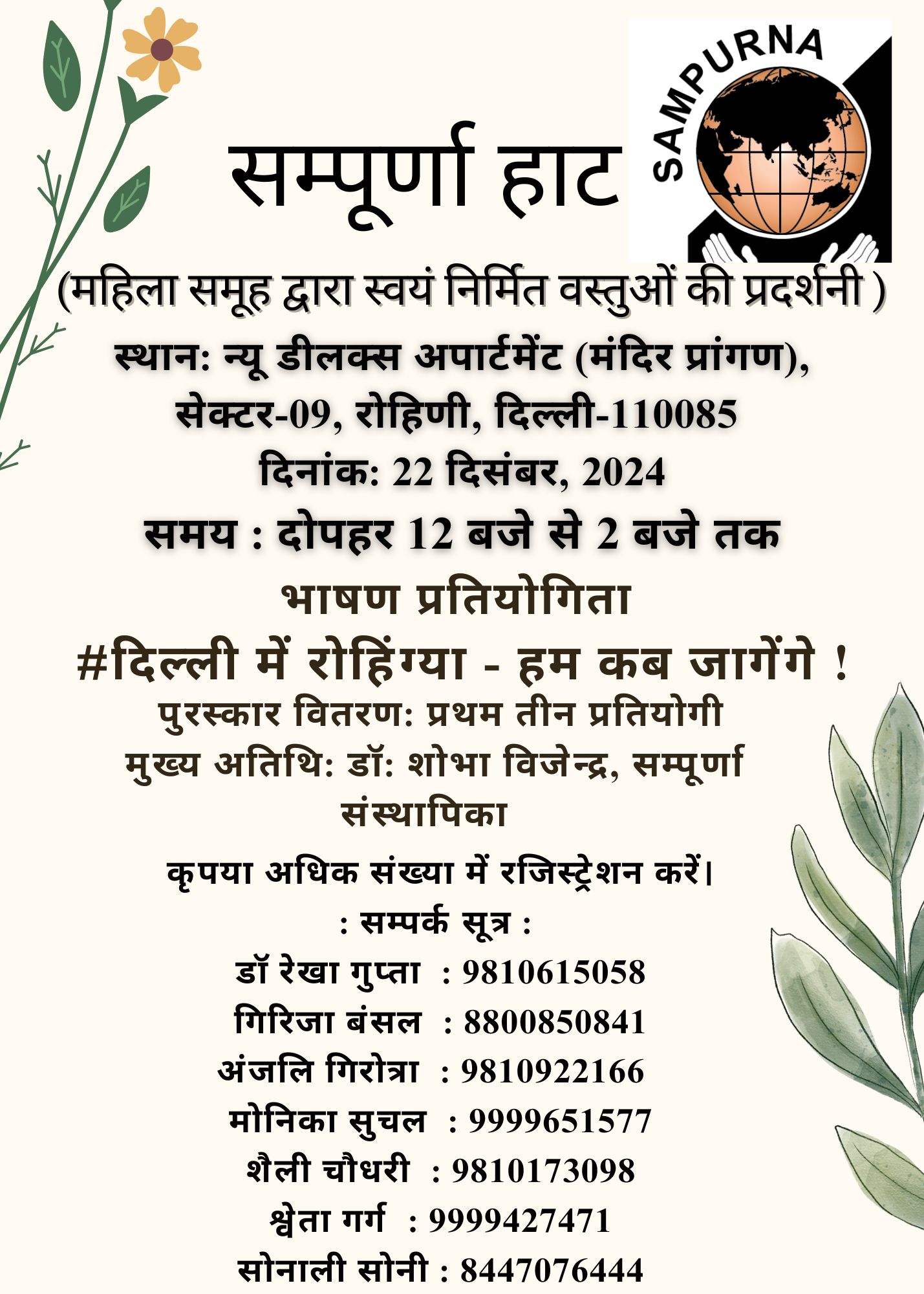 सम्पूर्णा हाट (महिला समूह द्वारा स्वयं निर्मित वस्तुओं की प्रदर्शनी ) स्थान: न्यू डीलक्स अपार्टमेंट (मंदिर प्रांगण), सेक्टर- 09, रोहिणी, दिल्ली-110085 दिनांक : 22 दिसंबर, 2024 समय : दोपहर 12...